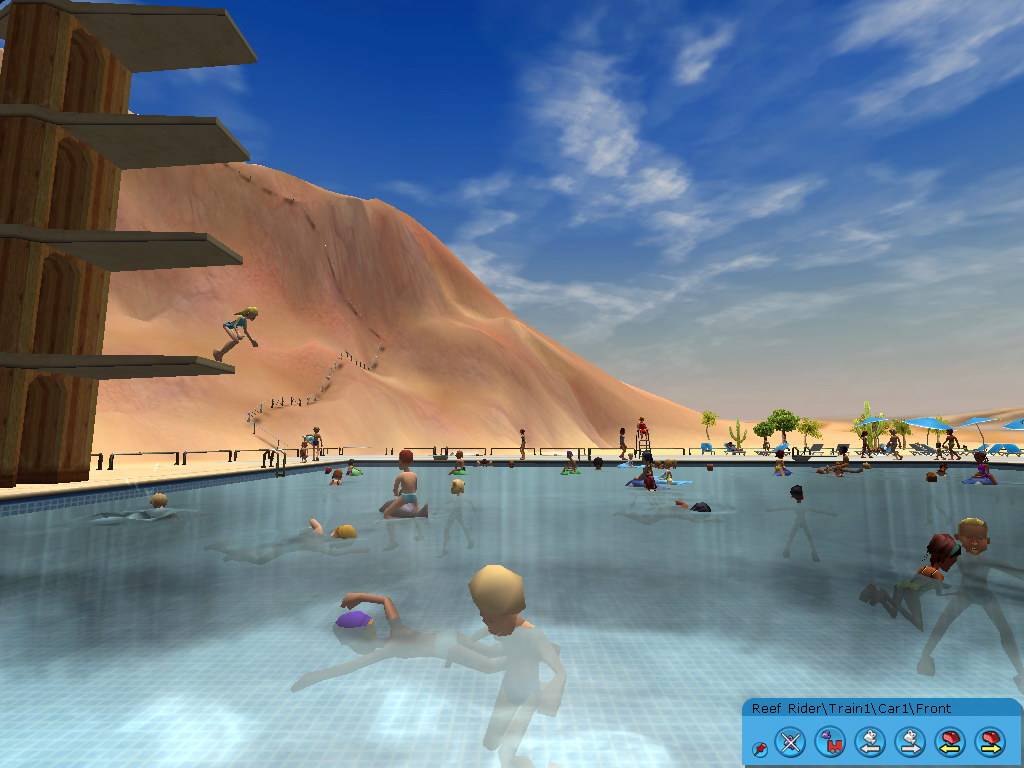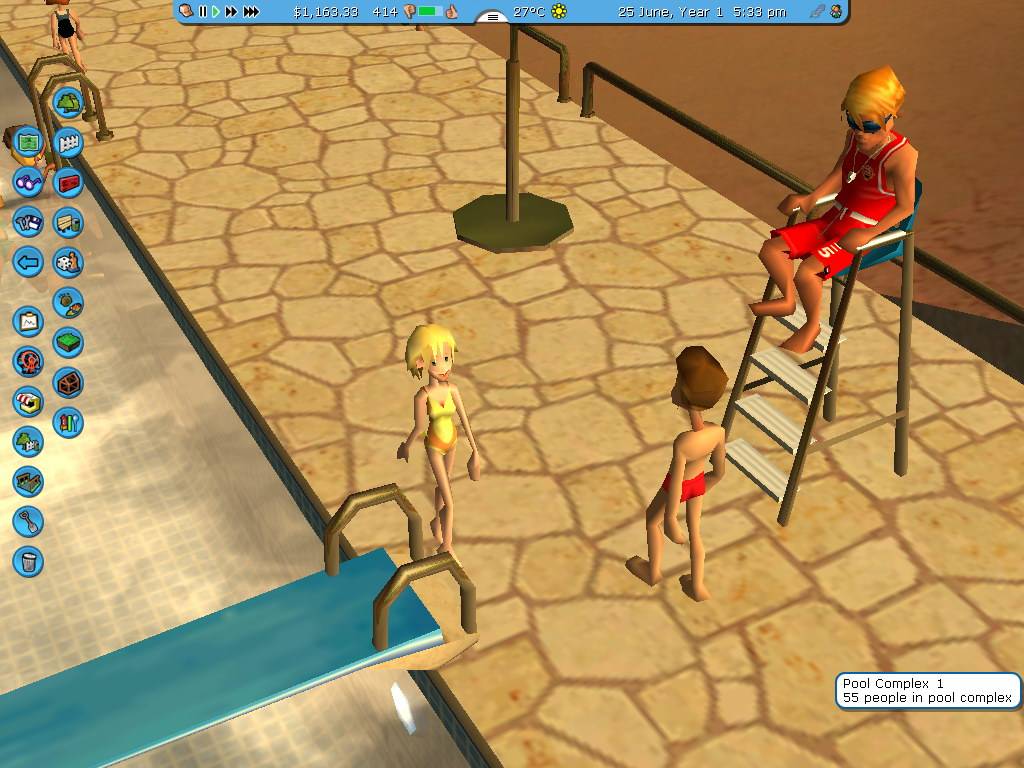 Kezdjük is rögtön az újdonságokkal, hiszen egy kiegészítőnél másról nem is nagyon írhatunk. :-) A Soaked! alapja a strand, ezt új menüben találjuk a különböző ride-oknál. Kialakíthatjuk a medencét, mely persze nemcsak klasszikus négyzet lehet, hanem mindenfajta formájú. E mellé kell helyeznünk a csempézett teret, ahol a strandolók közlekedhetnek vagy „száraz-idejüket” tölthetik. Erre a területre tehetjük a napágyakat, pezsgőfürdőket, zuhanyzókat, stb. A medencékbe is tehetünk hullámgépet és víz alatti lámpákat, melyek az éjszakai hangulatot dobják fel. És persze ugródeszkákat is adhatunk a látogatóinknak. Kicsiket is, melyek a medence szélén állnak, és emeletes toronyugró deszkákat is.
