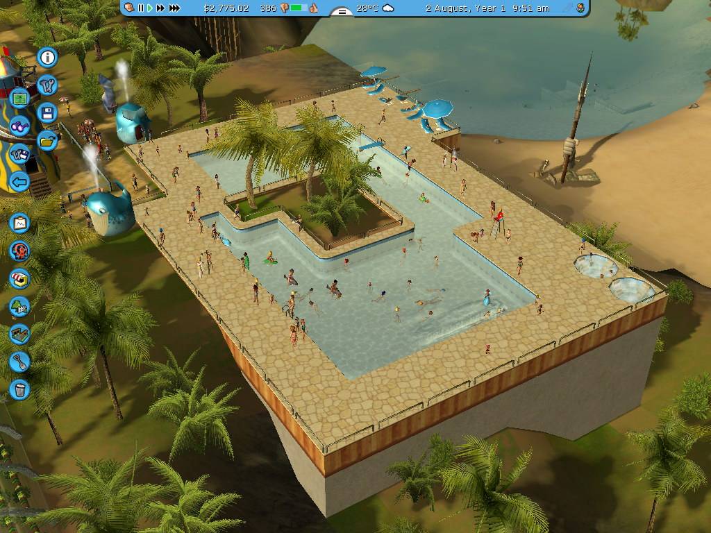 A másik új érdekes installáció egy vízágyú. Ezt a kedves gépet élőben is volt szerencsém tesztelni a nyáron egy valósi vidámparkban. Ez arra jó, hogy a járókelők megviccelhetik a többieket, és rendesen a nyakukba locsolhatnak. Az élvezet akkor maximális, ha a vízágyú egy nagyobb terep feletti részen van (mondjuk egy hídon vagy felüljárón). Ennek sajnos nincsen belépődíja (a valóságban egy euróssal működött :-), így ezen nem szedhetjük meg magunkat, de azért vicces. Újdonság még – a vízhez kapcsolódva – két új téma. Ahogy eddig vadnyugati, horror, kalóz stb. témákban lehetett játékokat és díszletet választani, úgy most már építhetünk Atlantisz és Hawaii témákban is.