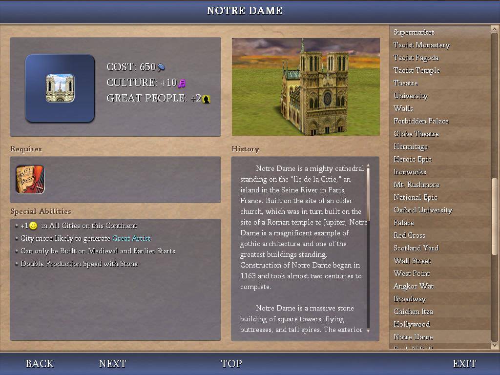 Hasonlóan az előző Civilization játékokhoz, itt is egy telepessel indulunk, 4000 évvel időszámításunk kezdete előtt a világ feletti hatalom megszerzéséért. A telepessel először megalapíttatjuk első városunkat, majd elkezdjük felépíteni birodalmunkat. A játék folyamán kutatunk, fejleszthetjük a városokat (azaz különböző épületekkel és csodákkal gazdagítjuk), de ne feledkezünk meg a városok környékéről sem, ahol gazdaságokat, malmokat, bányákat, utakat, vasutakat és még egy pár hasonló fejlesztést építtethetünk munkásainkkal, ezzel is tovább növelve a környezetünkben található erőforrásokból befolyó pénz, ásvány és élelmiszer mennyiséget. A befolyó erőforrások végül is a kincstárunkat gyarapítják, a kutatások finanszírozására fordítódnak, megeszik a lakosok, és még számtalan módja van az erőforrások hasznos felhasználásának. A játékos a városokban épületeket emel, ezek megjelenése a palettán szorosan kötődik a kutatásokhoz, azaz a civilizáció fejlettségéhez, hasonlóan a katonai egységekhez. Új elem, hogy a városok környékén felépíthető fejlesztések is kutatási szintekhez kötődnek. Ezen túlmenően világcsodákat is építhetünk. A világcsodák olyan drága, de hatékony épületek, amelyekből az egész világon csak egy építhető fel. Ha valaki már felépítette, akkor más már nem kezdhet hozzá, illetve ha valaki építés közben volt, amikor valaki más már befejezte, az megkapja az építésre addig fordított erőforrást pénzben (így legalább valami visszajön az erőfeszítésből a kincstárba). Akinek ez a koncepció nagy vonalakban ismerős, annak igaza van, ez volt az alapja eddig is a Civilization játékoknak. Ami valódi újdonság az az, hogy a 3D megjelenítés lehetővé tette, hogy a városban felhúzott épületeket és a csodákat magán a főtérképen is látjuk, a térkép közelíthető távolítható és forgatható is. Ez utóbbit egyszer poénból kipróbáltam, de nem használom, mert a térképet szerencsére úgy készítették el a fejlesztők, hogy az alapbeállításnál minden jól látható, az épületek, az egységek vagy a városok nem takarnak el semmi lényegest.