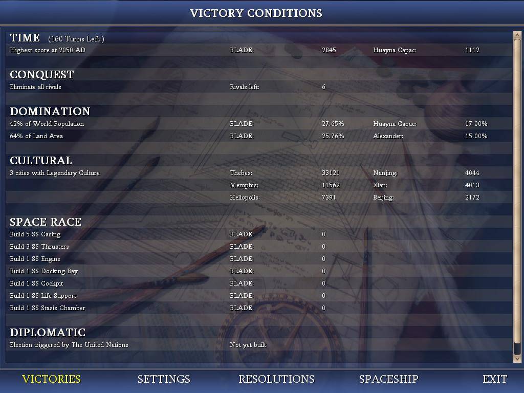 Több győzelmi lehetőség is van a játékban. Először is a szokásos „mindenkit legyaktam” jellegű háborús győzelem, amikor is a játékos minden más birodalmat szőröstül-bőröstül meghódít. Hasonló ehhez a dominancia, amikor a világ jó része (a területek és az emberek egyaránt) a mi fennhatóságunk alá tartozik. Kifejezetten békés győzelem a kulturális, amikor három olyan városuk is van, amelyik legendás hírű (azaz több mint 50000 kulturális pontja van), van még a diplomáciai és végül a kutatási-termelési győzelem, amikor az a győztes, aki elsőnek építi fel azt a csillaghajót, amelyik az Alpha Centaurira viszi majd az első idegen világbeli telepeseket.