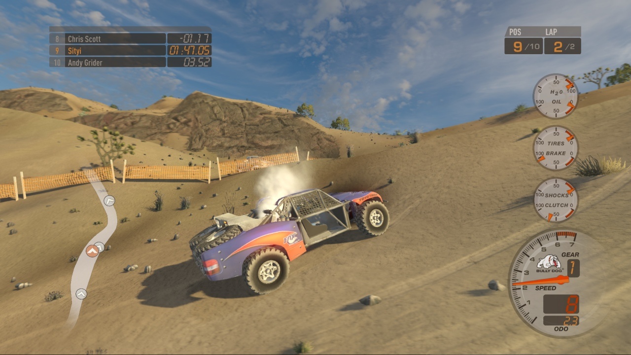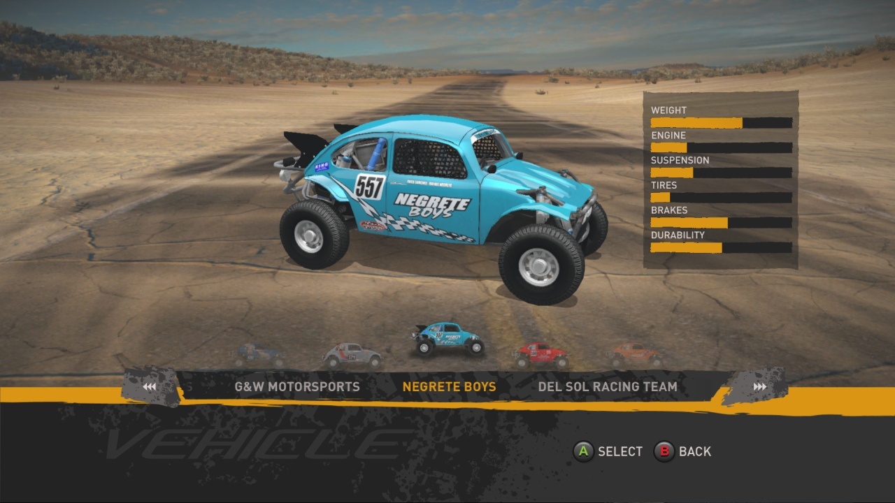 No jó, eleget ostoroztam a grafikát, nézzük a tartalmat! Több mint 100 pálya, 9 szabadon bejárható-felfedezhető terep, és persze a klasszikus Baja verseny a maga 250, 500 és 1000 mérföldes távjaival. 160 járgány – itt egy picit álljunk meg. Más játékokban is láthattunk ilyet, hogy az alapmodell enyhén tuningolt változatát külön számolták a fejlesztők – és ahogy nézem, itt is hasonló a helyzet. Csak a VW Bogár buggy változataiból van vagy 3-4 féle. Khm. Van karrier, lehet csak úgy versenyezni vagy egyedül autókázni, a multi pedig nem csak neten keresztül megy, hanem osztott képernyőn is – akár négyen is lehet egy gépen tolni. A karriermód brutálisan le van csupaszítva: pénzt és XP-t gyűjtögetünk az egyes versenyeken való részvétellel – előbbiből vehetünk új kocsikat és fejleszthetjük a meglévőket, utóbbival nyílnak meg az újabb géposztályok, és ezzel együtt az újabb bajnokságok és meghívásos versenyek (ahol még több lé és tapasztalati pont a tét). Ja, és ahogy egyre több bajnokságot nyerünk meg, úgy lesznek elérhetőek az újabb és jobb szekerek a sima versenyeken. És ennyi. Mindez olyan sótlan körítésben, hogy az ember önkéntelenül is a chipseszacskó után nyúl.