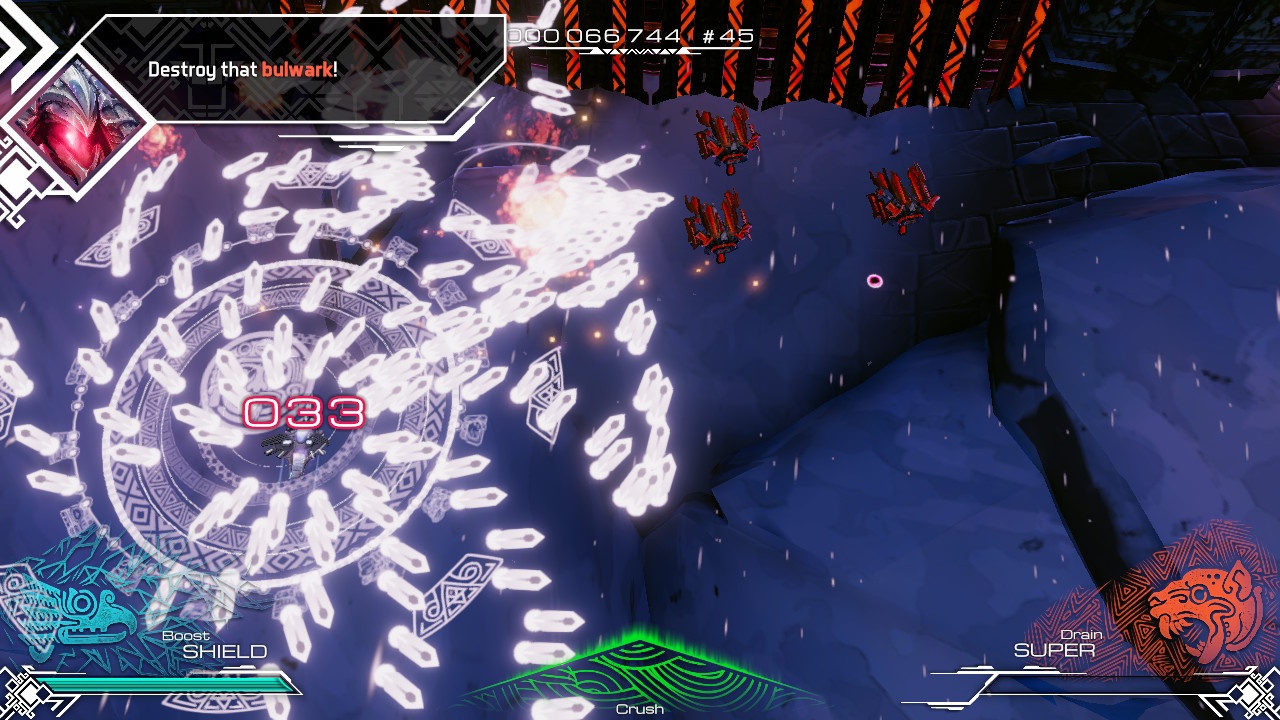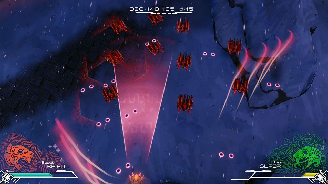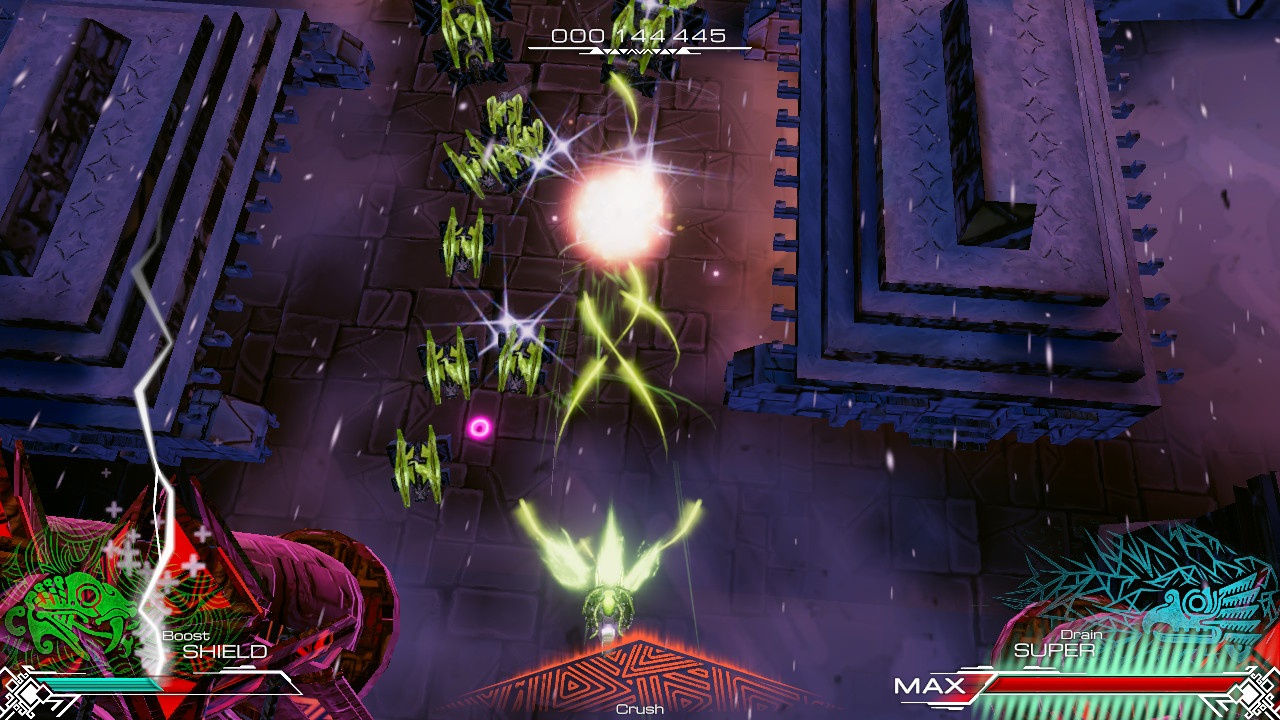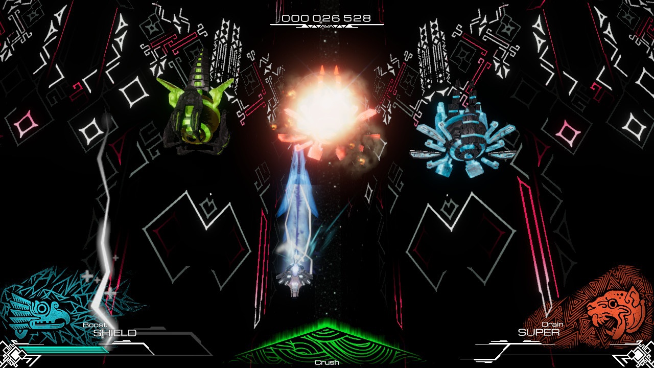 A Chukaru összesen három, egyaránt hatásos fegyvert hordoz, amelyek (az Xbox kontroller gombjainak megfelelő sorrendben) piros, zöld és kék sugarakat lőnek ki. Ugyanilyen színűek az ellenünk érkező hajóhadak garmadái is, akiket azonban nem mindegy, milyen színű sugárral lövünk. A velük megegyező szín visszatölti hajónk energiáját (boost), míg a másik kettő vagy a szuperfegyverünket (ez a negyedik használható gomb, a sárga) tölti újra (drain), vagy nagyobb sebzést okoz (crush) – a hatás hajótípusonként eltérő. Ez a háromféle színen alapuló metódus nagyon ötletes, és abszolút üde színfoltot hoz a stílusba, ami nagyon is feldobja a játékmenetet.