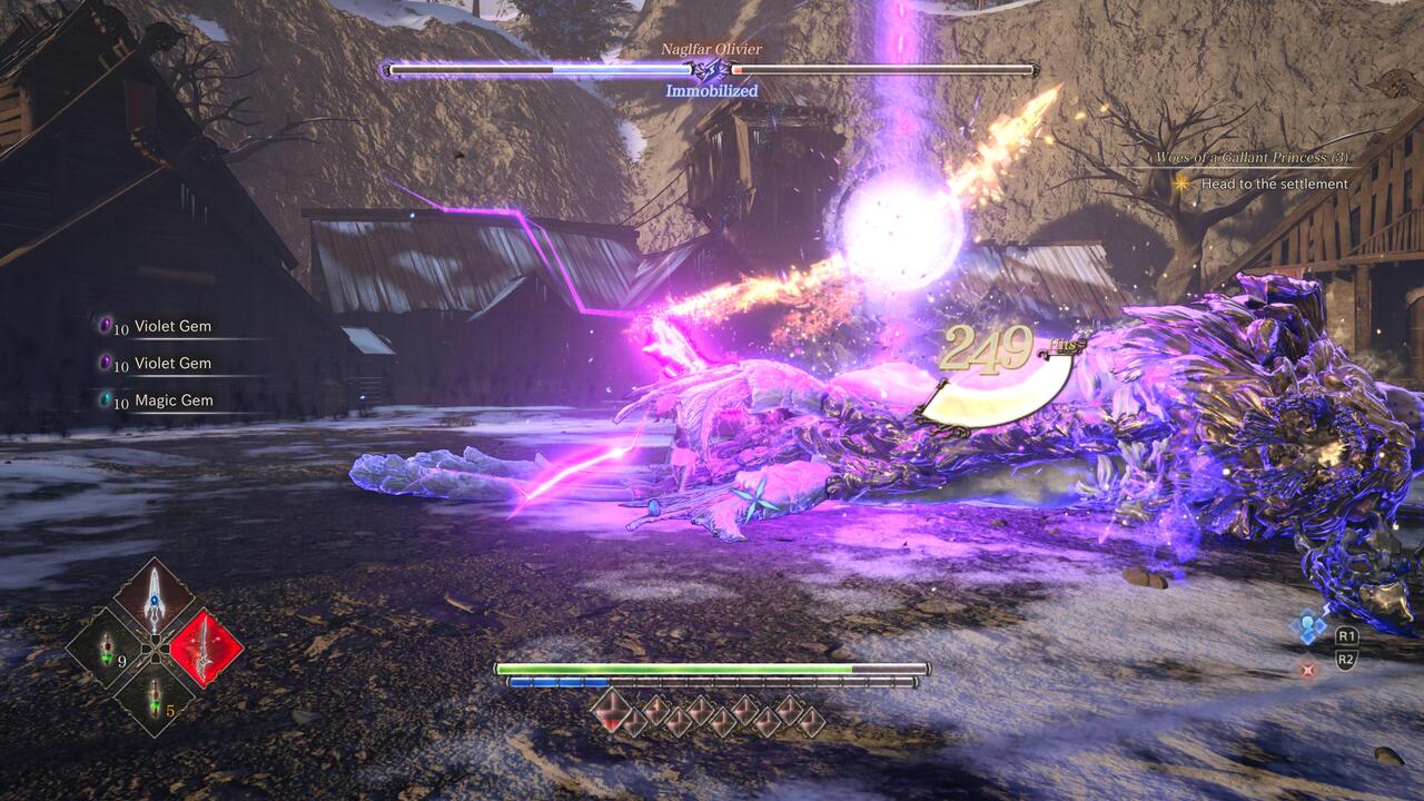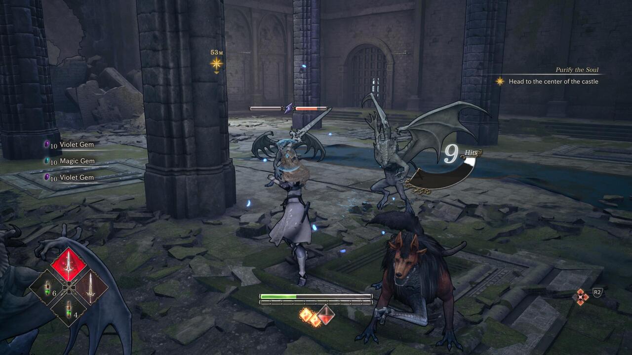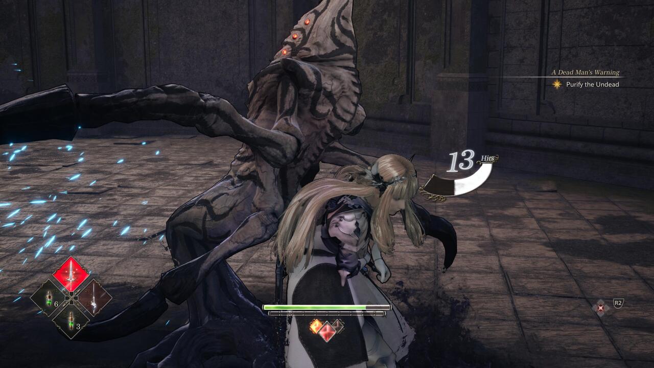 Külső nézetből terelhetjük a valkűrt, a kamera szabadon forgatható, de sokszor nagyon vacakul beragad az ellenfélkijelölés ellenére is. Nem tudom, milyen megfontolásból kezdtem egyből Hard nehézségi szinten, de úgy egészen kellemes kihívás elé állított a stuff az első 10 órában (a Ninja Gaidenen nevelkedett gamereknek jó hír lehet, hogy novemberben érkezik egy még nehezebb szint). A történet első felében nehézkesen indulnak be a csaták, mert effektíven támadni csak a lények gyengeségeit kihasználva lehet. Mind rendelkezik egy adott elementális kaszttal (például jég, tűz stb.), amit az ellenkező varázslat tör fel. Már a sztori elejétől fogva özönlenek ránk a tűzre érzékeny egységek, de a gyógyszert rájuk jóval később lelhetjük fel. A történet folyamán hat különféle fegyverrel oszthatjuk a halált (a digitálisan vásárlók kapnak plusz két kardot), amelyek eltérnek mind mozgás, mind pedig sebességben.