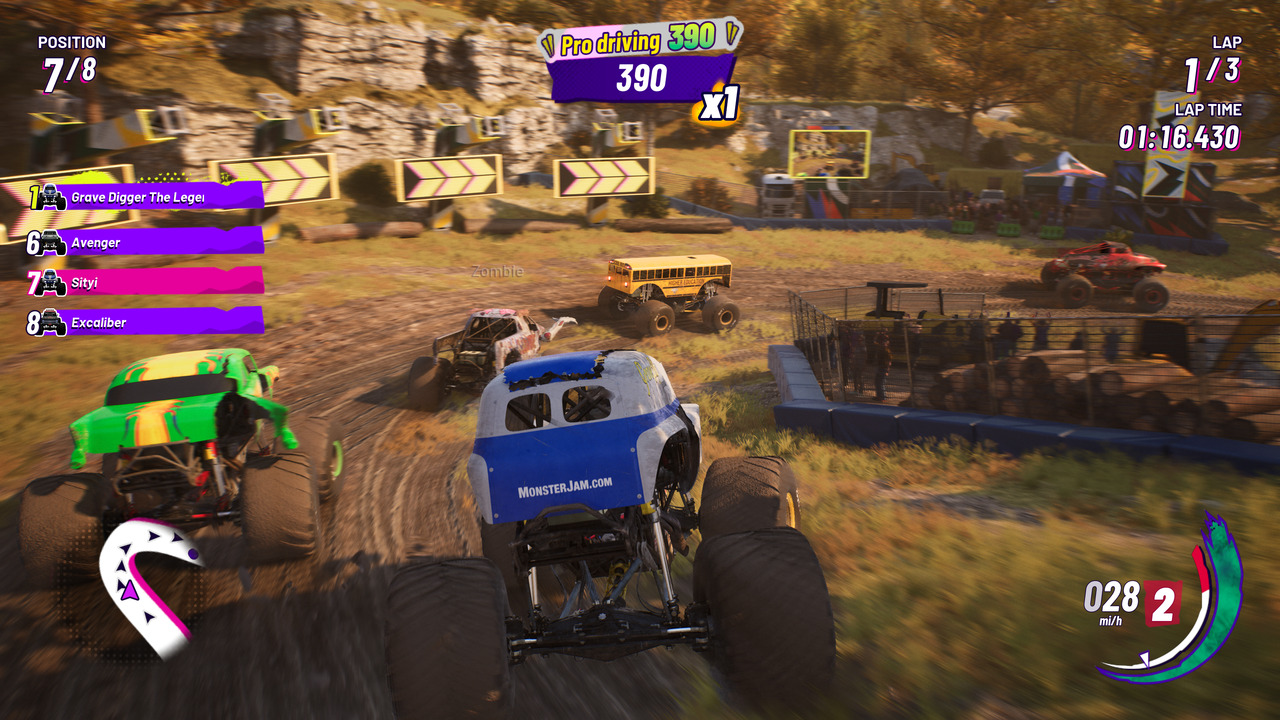 Ahogy haladunk előre, kapjuk az XP-t, az üveggyöngyöt (profilcicomák, győzelmi pózok), új autókat – van vagy 50 belőlük, és természetesen az olyan legendák is jelen vannak, mint Grave Digger, Megalodon vagy Max-D (sőt, az egyik képen még egy szép rózsaszín unikornis, Sparkle Smash is kiszúrható).