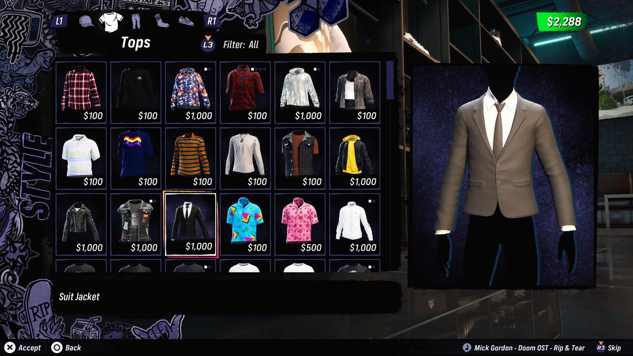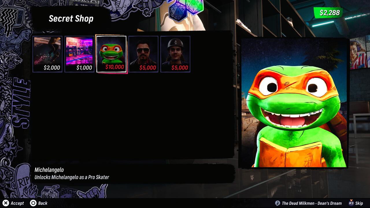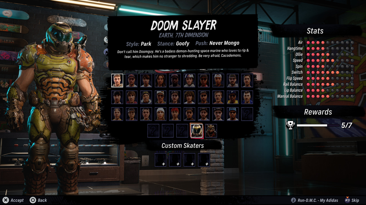 Természetesen az eredeti részek minden pályája itt van most is, természetesen feltupírozva, és Los Angeles egy kicsit átalakítva. Az, hogy öregszem, sajna már nemcsak a nemrég megtörtént látásvizsgálatom eredménye támasztja alá (mostantól multifokális lencse kell a szemüvegembe), hanem az is, hogy a játékban szereplő 31 deszkásból ijesztően sokat nem ismerek. Persze az ifjú titánok közül rémlik jó pár, akikkel az 1+2-ben is gurulhattunk, de így is kb. a harmaduk teljesen új errefelé. Nem panaszkodom, csak én a nagy öregekhez vagyok szokva... Apró érdekesség, hogy Bam Margera majdnem kimaradt a játékból, és csak Tony állhatatosságának köszönhető, hogy bekerült. Természetesen vannak vicces karakterek is: Jack Black alakításában Officer Dick, illetve a Tini Nindzsa Teknőcökből Michelangelo tényleg megmosolyogtató, de Doom Slayer és a Revenant a rebootolt Doomból először inkább volt meghökkentő... Poénnak persze óriásiak ők is.