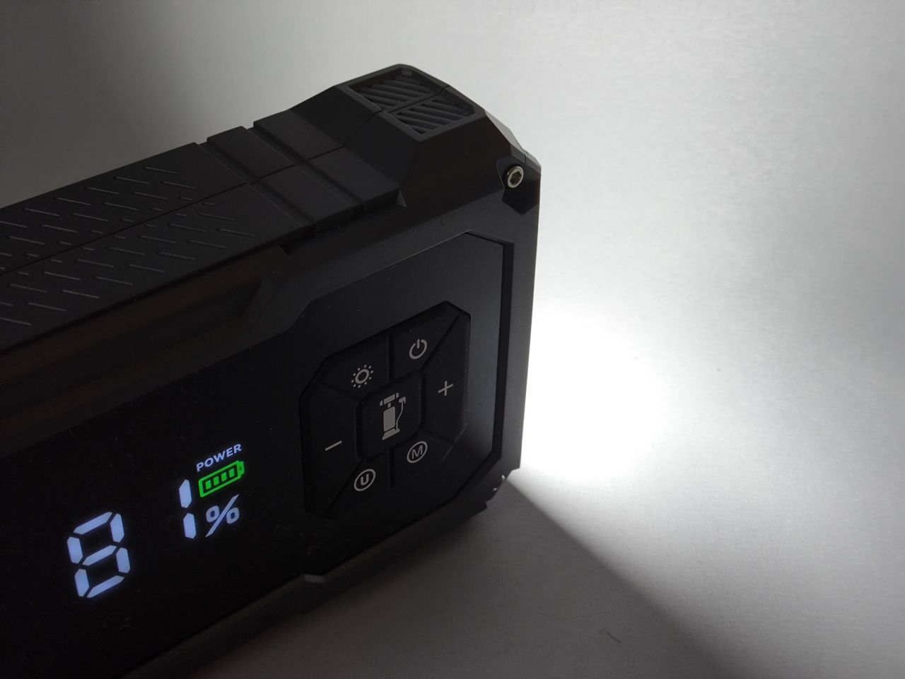 Egy nagyméretű LCD-kijelzőt találunk a terméken, amely jelzi a benne lévő akku töltöttségi szintjét, vagy például az aktuális keréknyomást. Mellette találhatók a kezelőgombok, amelyekkel ki- és bekapcsolhatjuk a különböző funkciókat, elindíthatjuk a pumpálást, vagy beállíthatjuk a lámpa üzemmódját (folyamatos vagy villogó fehér fény, valamint villogó piros közül választhatunk).