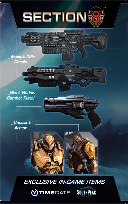 Akik előrendelik a TimeGate Studios sci-fi akciójátékát a Section 8-t szert tehetnek pár hasznos játékbeli tárgyra is. Kapnak egy jóval strapabíróbb páncélt a Captain’s Armourt, a SIW7 “Black Widow” Combat Pistolt és két Assault Rifle változatot a normál fegyverarzenál mellé. A játék szeptember 11-én érkezik majd meg Európába, egy hetes késéssel a korábbi tervekhez képest.