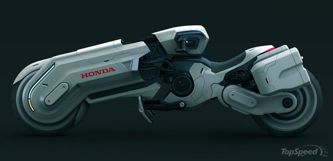 Peter Norris dizájner autók koncepciójának elkészítésére szakosodott, most viszont egy jól ismert kétkerekű járgányra fókuszált rá, méghozzá a Star Warsból ismert robogóra. A sci-fi elemek mellett azért - saját bevallása szerint - a mangábók is sokat merített, s ezekből is felhasznált elemeket, mikor megtervezte a két elektromos motor által hajtott Honda Choppert, amit - ha egyszer elkészülne - természetesen SityiSXT kolléga tesztel majd le...:)