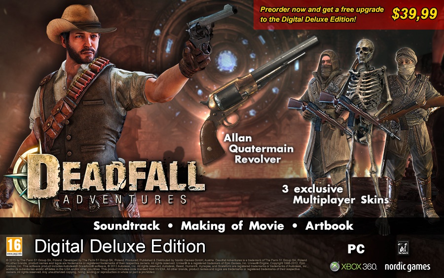 Szűk két hónap és megjelenik a The Farm 51 új játéka, a Deadfall Adventures. A játék témáját tekintve sokban emlékeztet az Indiana Jones történetekre, hisz egy ereklyevadász kalandjait élhetjük át a náci uralom idején. A játék már előrendelhető a Steam áruházában, ráadásul aki így határoz, az az alapjáték áráért a Deluxe kiadást kapja meg. Ez három exkluzív többjátékos karakter mellett Allan Quatermain revolverét is megkapja, valamint a játék zenéit és a fejlesztésről készült videót is megtalálja a művészi album mellett.