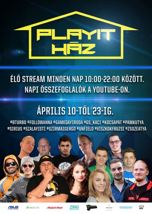 A PlayIT már régóta kiemelt szerepet ad a népszerű youtube-osoknak, mi magunk is megdöbbenve láttuk a dedikálásoknál kígyózó sorokat a legutóbbi rendezvényeken. Az április 29-i, budapesti PlayIT Show-n is számos videós képviseli majd magát, azonban a szervezők ennél többet találtak ki, és a valóságshow-k mintájára készítik el két héten át - április 10-23. között - a PlayIT Házat. Minden nap négy videóst zárnak össze egy-egy napra, reggel 10-től este 10-ig különböző feladatokkal szembesítve őket. Klasszikus és mai játékokkal kell majd játszaniuk, egymással versengeniük, vagy közösen megoldva egy-egy feladványt. Napi ellátásuk (azaz enni- és innivalójuk) pedig attól függ, hogy teljesítenek. A Duna Pláza melletti helyszínen akár személyesen is lehet szurkolni a résztvevőknek, de természetesen YouTube-on és Facebookon is követhető lesz majd minden élőben. Este pedig napi összefoglalókat tesznek közzé. A végső döntő pedig a PlayIT-en lesz, ahol kiderül, ki kapja a PlayIT Ház vándorkupát.