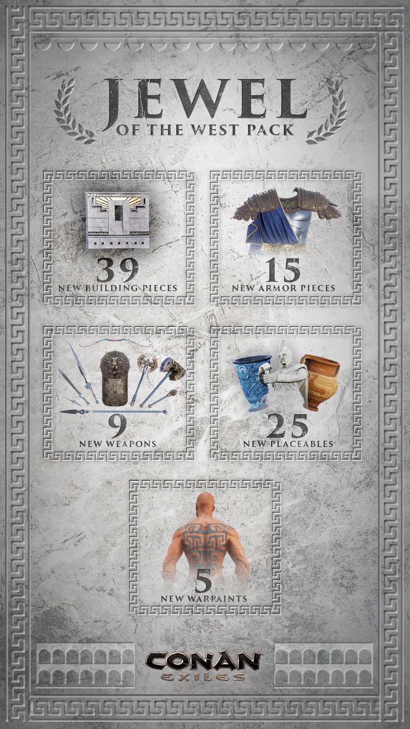 A Funcom nagyon büszke a játékára, amelyhez már az első DLC, a The Imperial East is megjelent. Hogy a sor ne szakadjon meg, a minap bejelentették a következő fizetős kiegészítőt, készül a Jewel of the West. Ahogy az első, úgy ez a DLC is elsősorban új épületekkel, berendezési tárgyakkal, fegyverekkel és páncélokkal bővíti a játékot, ám ezúttal a nyugati Aquilonia birodalom adja az ihletet. Arról egyelőre nincs hír, hogy ez mikor jelenhet meg.