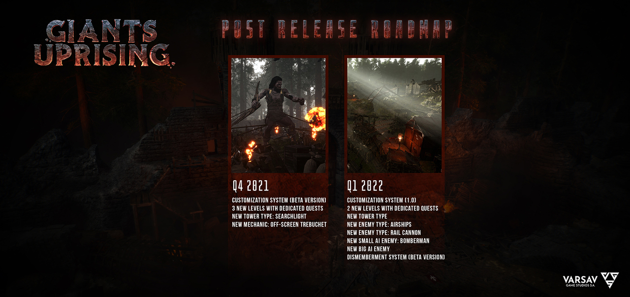 A Giants Uprising PC-re készül, a korai hozzáférésű verzió mellett pedig demo is elérhető Steamen. A fejlesztők tervei szerint még idén három új pályával bővül a játék, és béta verzióban megkapjuk a testre szabási rendszert is, jövőre az első negyedévben pedig további két pálya és új ellenségek érkeznek. Ugyancsak a Q1-ben várható a testrészek levágásának megjelenése is, első körben az is béta állapotban.
