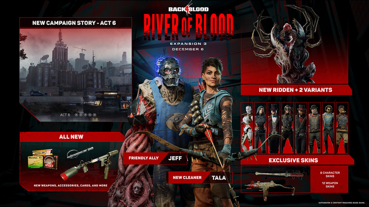 A River of Blood kiegészítő, a Trial of the Worm játékmód és a Back 4 Blood Holiday Event is december 6-án várható.