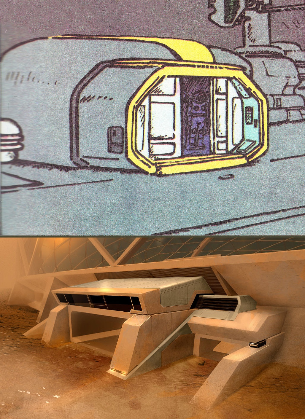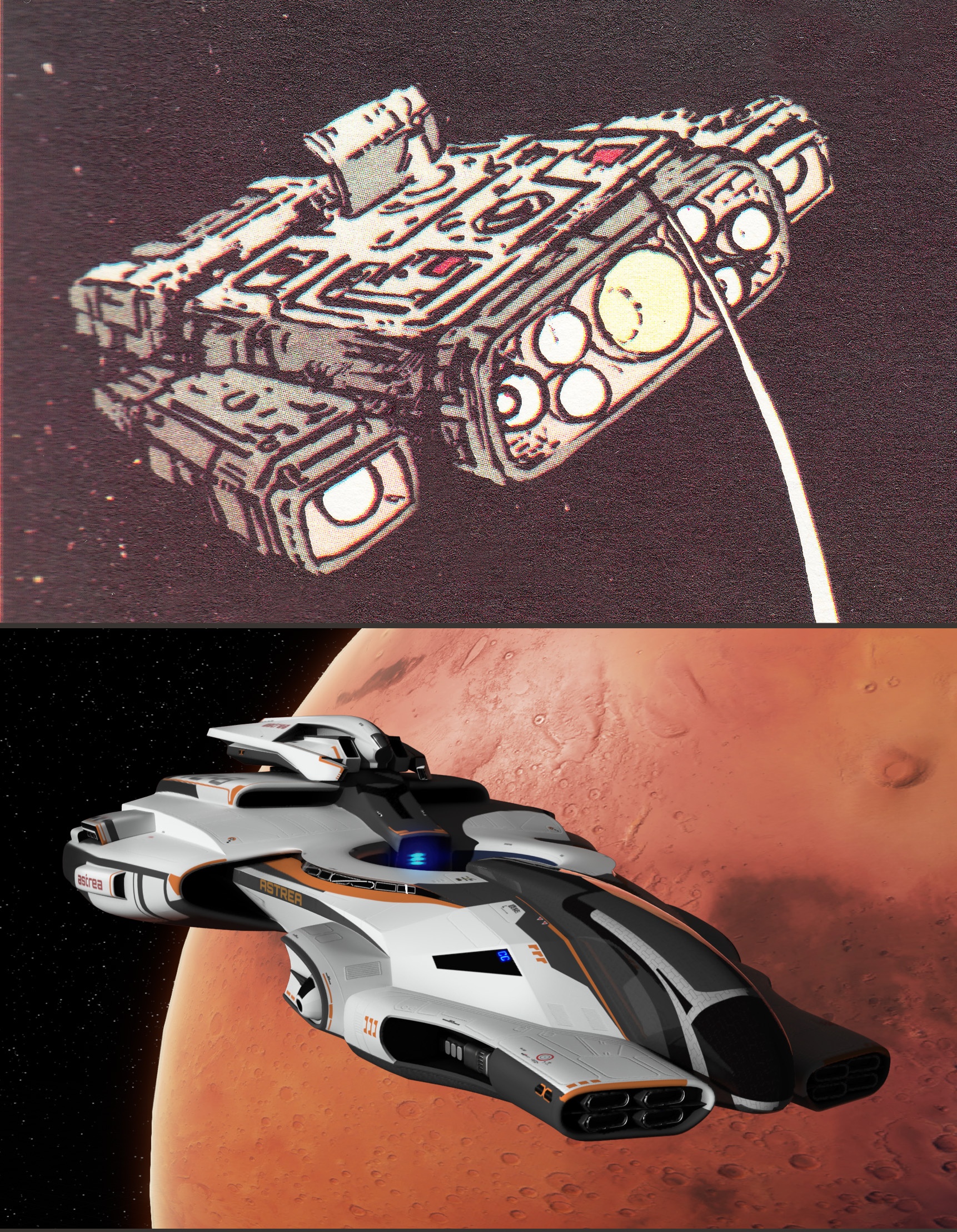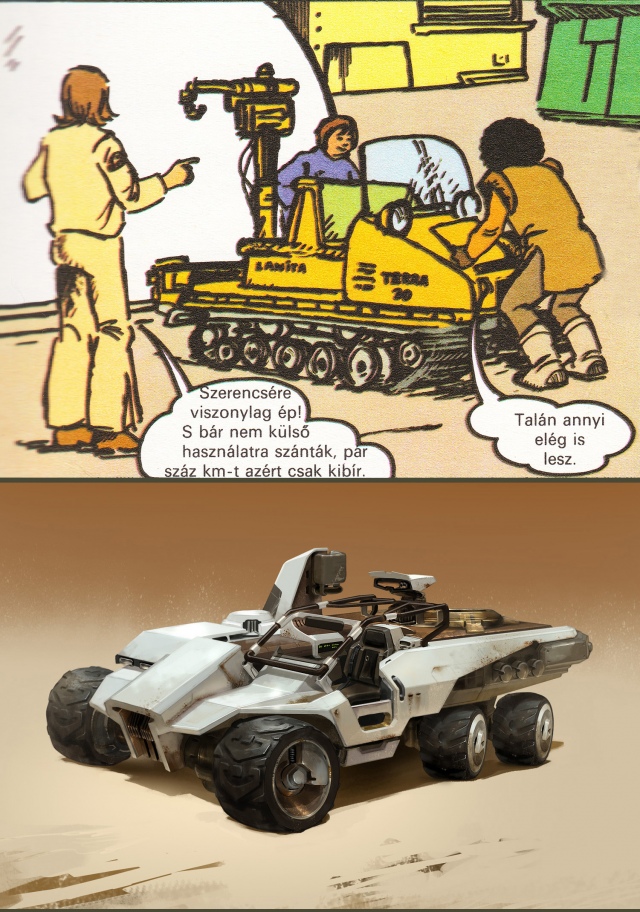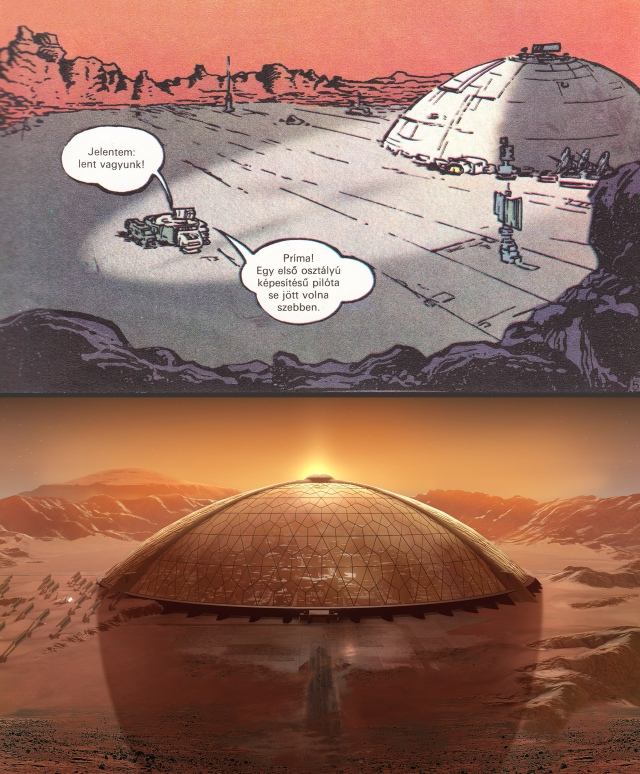 Vázlatokon a kihalt marsi város és a Teca űrhajó.